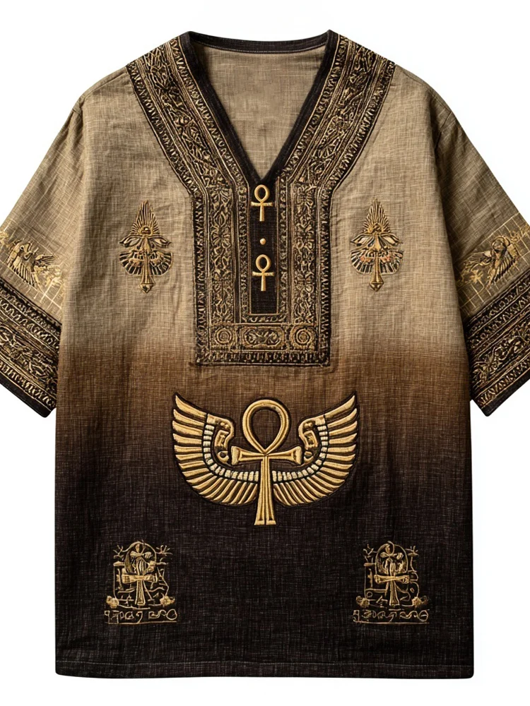 Ancient Egyptian Ankh Embroidered Gradient Linen Shirt