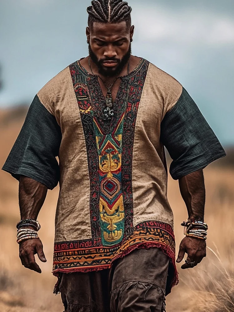 Men's African Ethnic Geometric Art Color Block Casual Linen Shirt