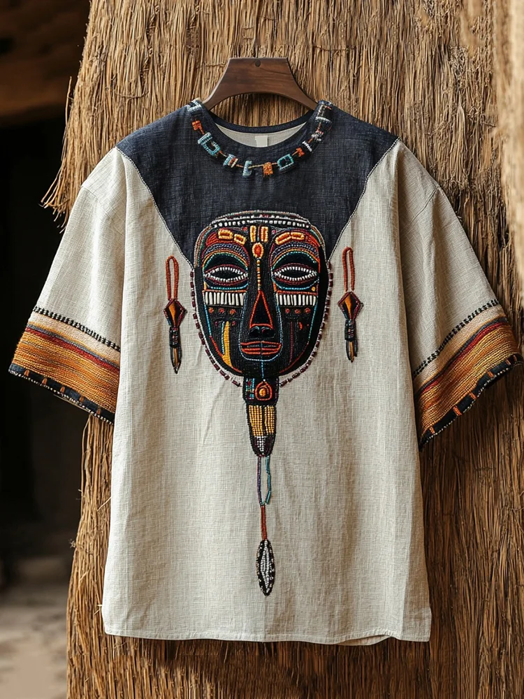 Men's Tribal African Masks Ethnic Art Print Linen T-shirt