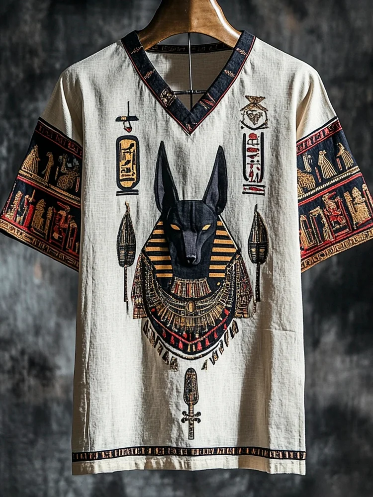 Vintage Egyptian Anubis Totem Men's Linen Short Sleeve Shirt