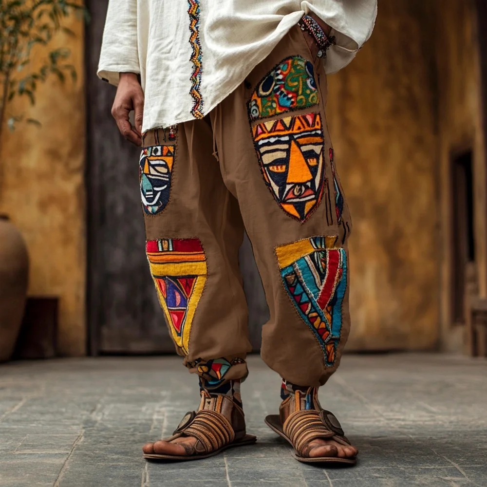 African Tribal Mask Embroidery Men's Linen Loose Pants