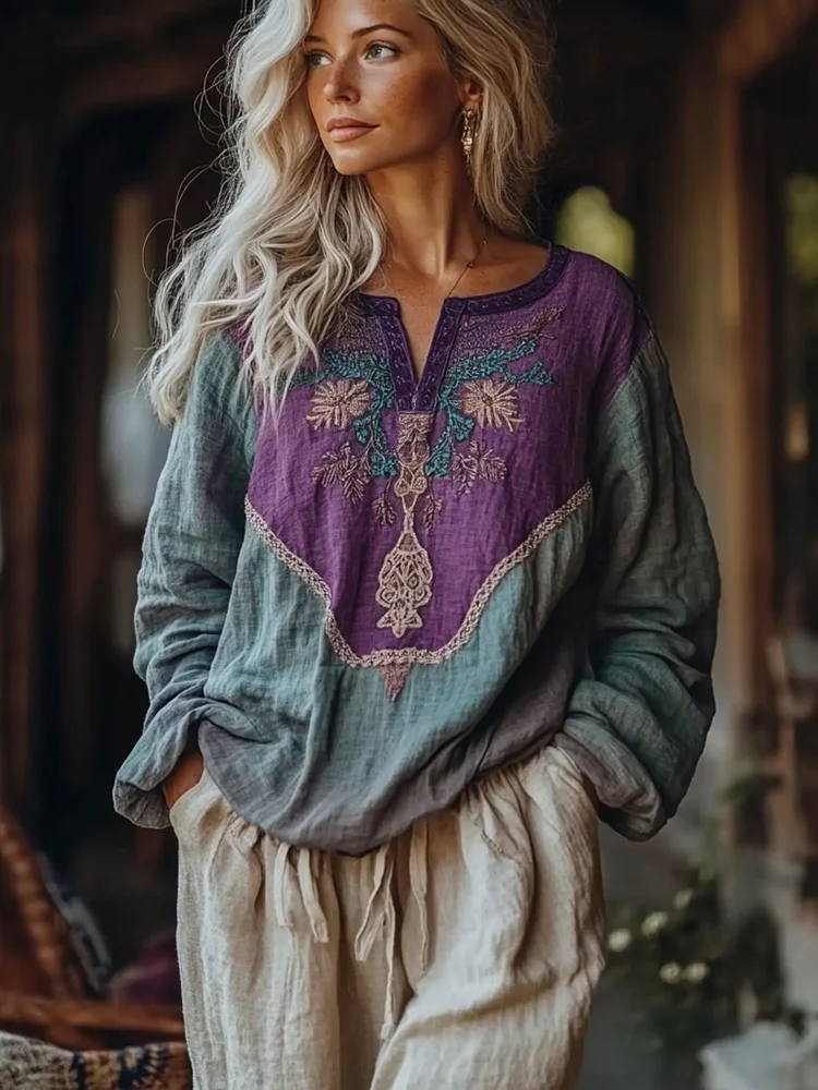 Bohemian Embroidered Floral V-neck Linen Blend Blouse