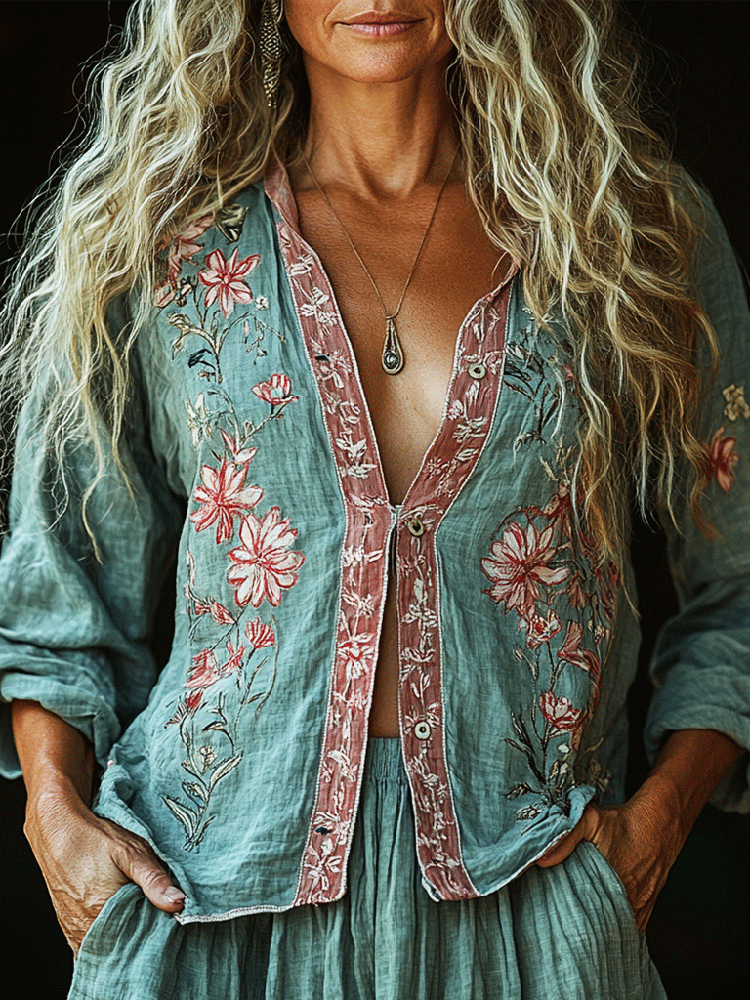 Bohemian Linen Floral Art Print Long Sleeve Shirt