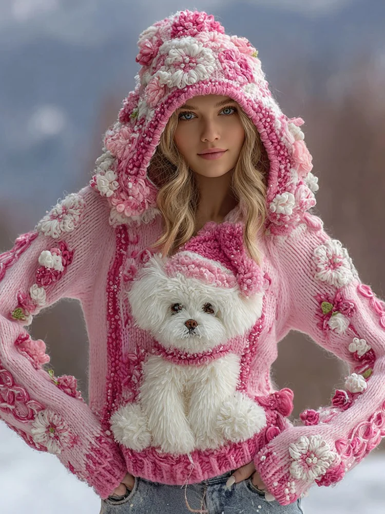 Cute Maltese Dog And Floral Knitted Jacquard Hooded Sweater