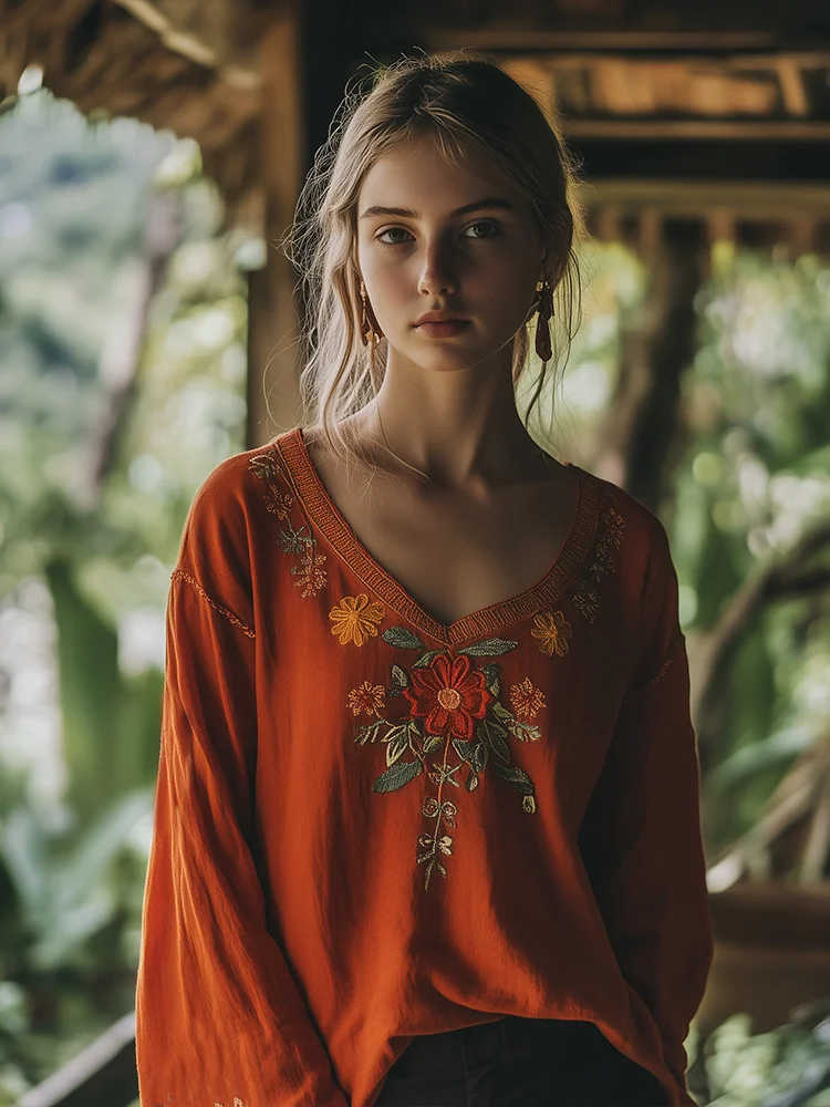 Fashionable Bohemian Floral Embroidery Linen V-neck Shirt