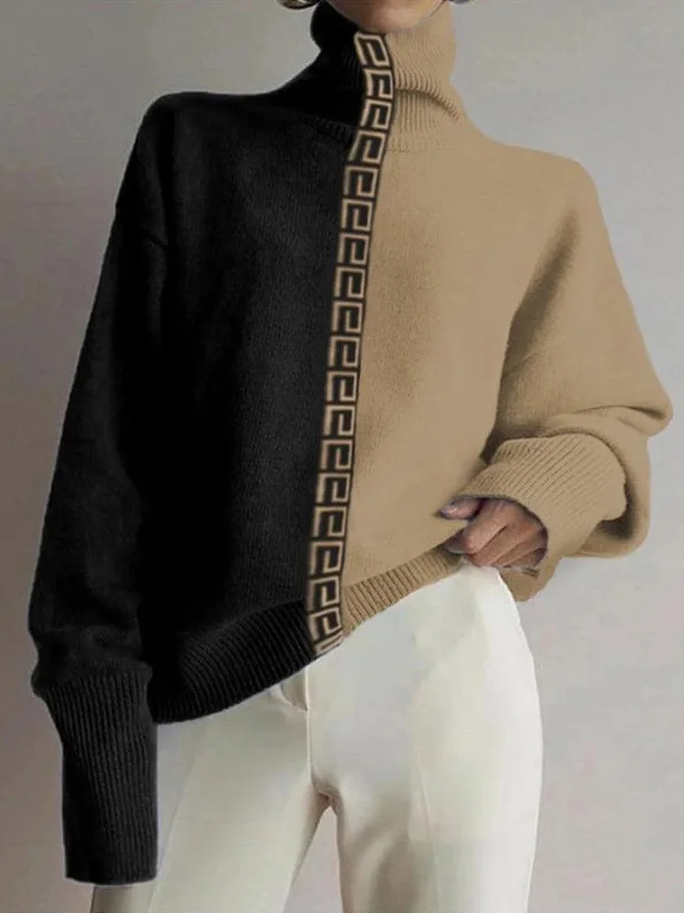 Greek Key Contrast V-neck Cozy Turtleneck Sweater