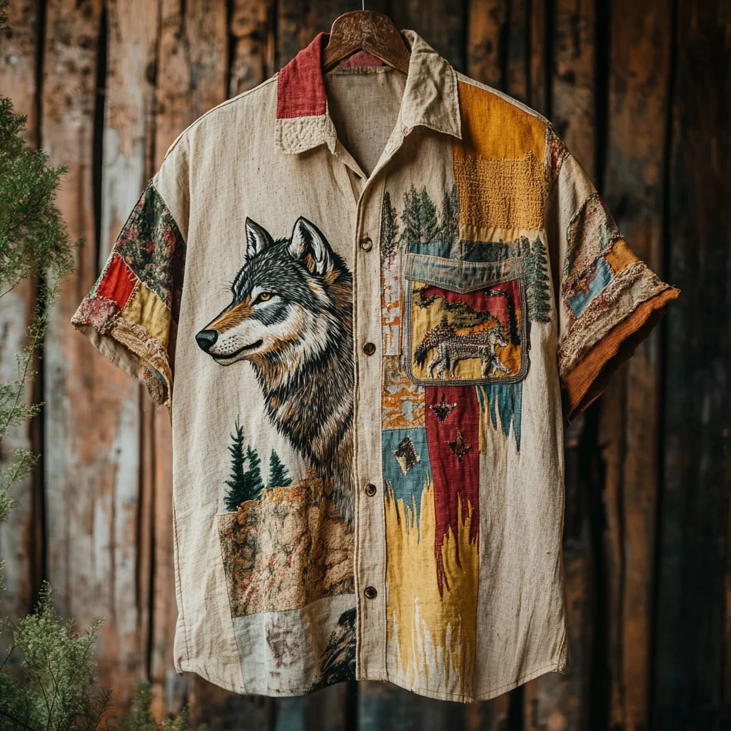 Men's Retro Wolf Patchwork Contrast Color Support Our National Parks Art Linen Casual Shirt
