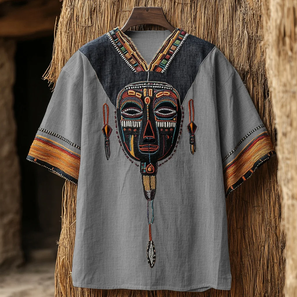Men's Tribal African Masks Embroidery Art Print Linen T-shirt