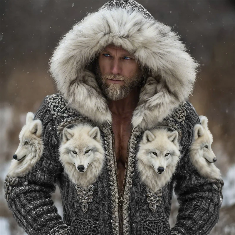 Men's Viking Fuzzy Wolf Celtic Cozy Fur Trim Hooded Cardigan