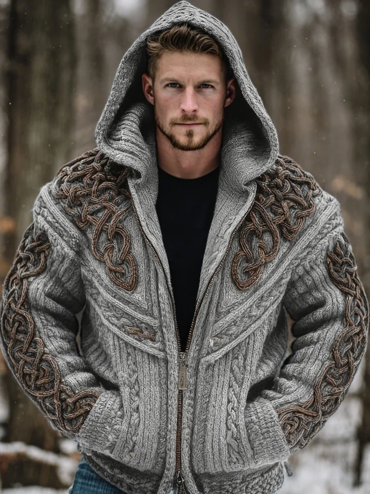 Men's Vintage Viking Celtic Knot Art Chunky Knit Hooded Zip-up Sweater