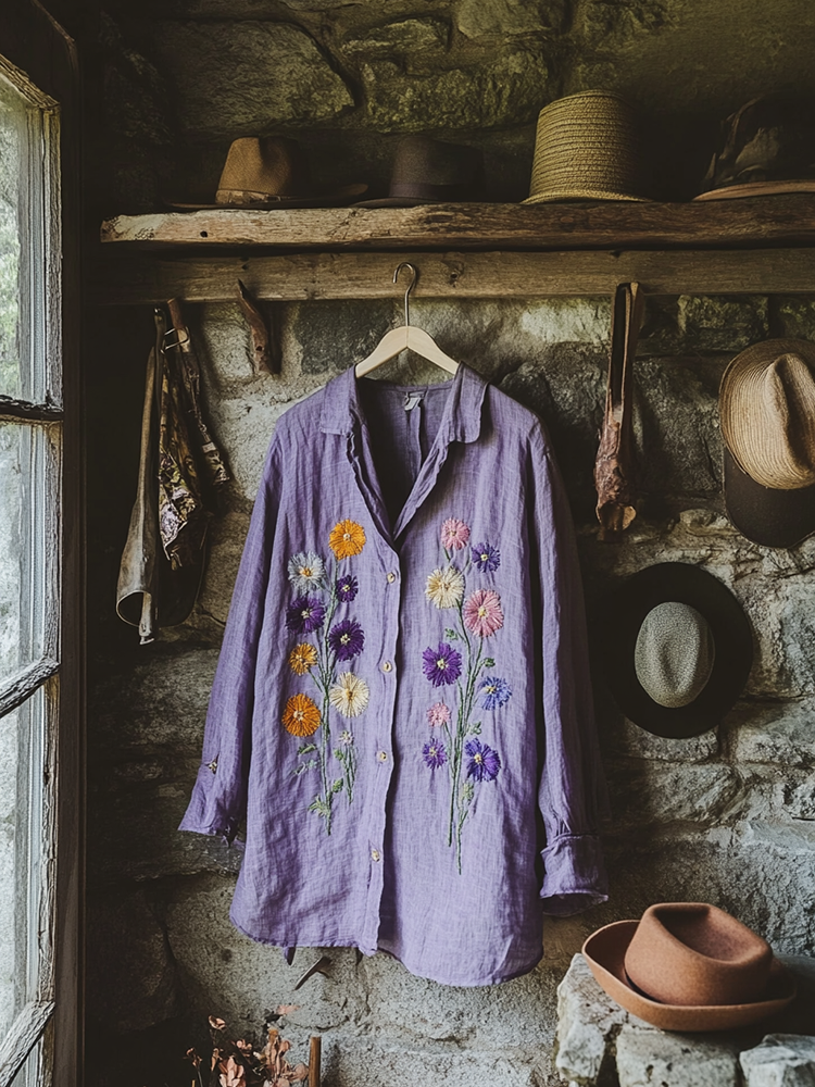 Retro Bohemian Holiday Style Linen Floral Print  Long Sleeve Shirt