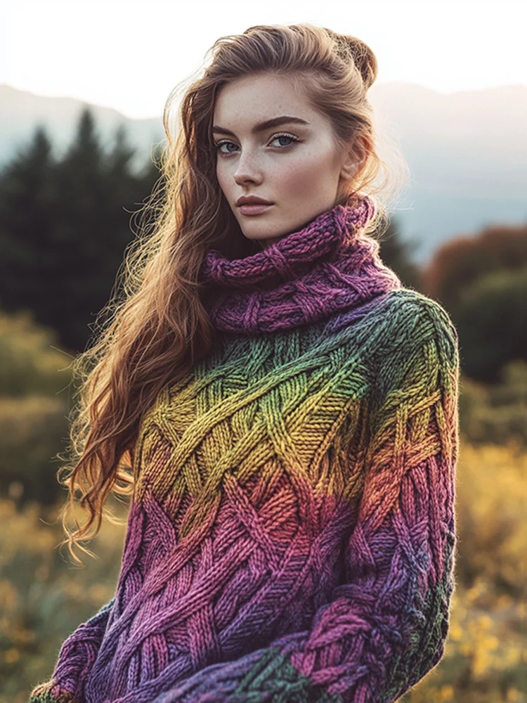 Retro Rainbow Warmth Celtic Knot Knitted Gradient Turtleneck Sweater