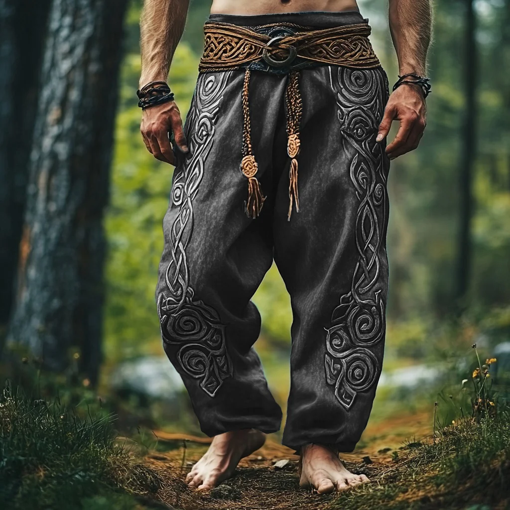 Tribal Viking Celtic Embroidery Art Linen Long Loose Wide-leg Pants