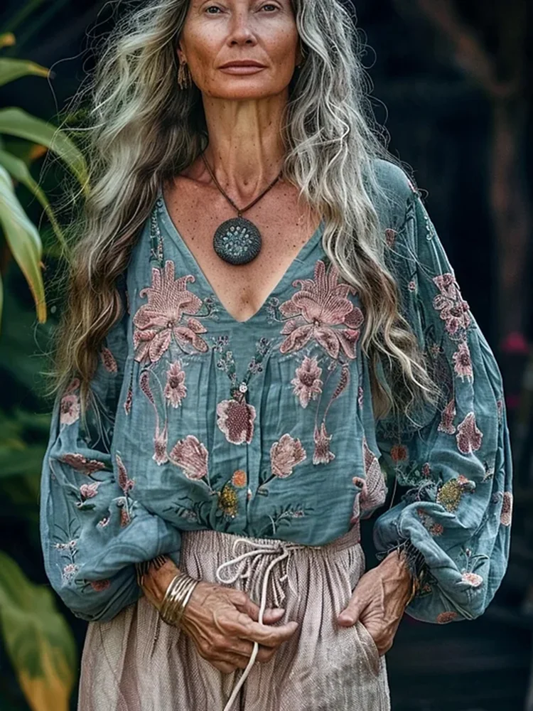 Vintage Bohemian Floral Linen Art Print Long Sleeve V-neck Shirt