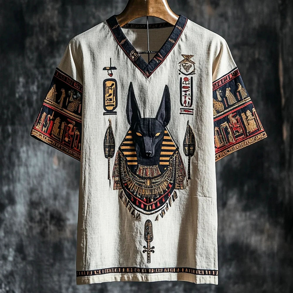 Vintage Egyptian Anubis Totem Men's Linen Short Sleeve Shirt