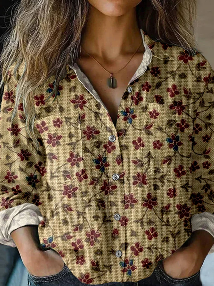 Vintage Floral Art Linen Print Long Sleeve Shirt
