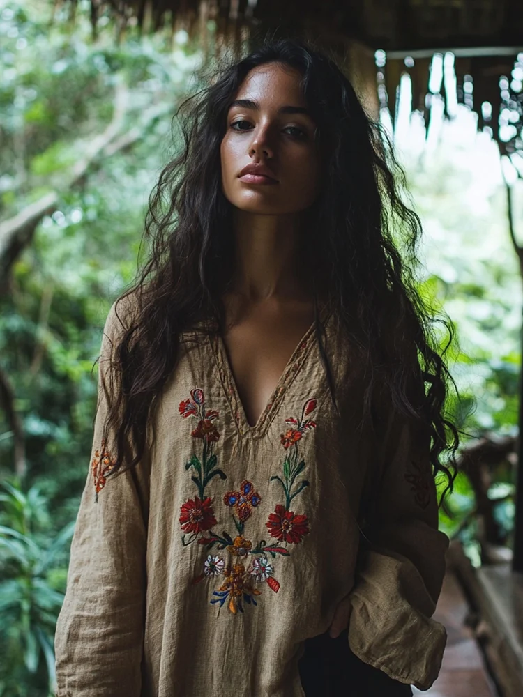 Vintage Floral Embroidery Art Linen Casual Shirt