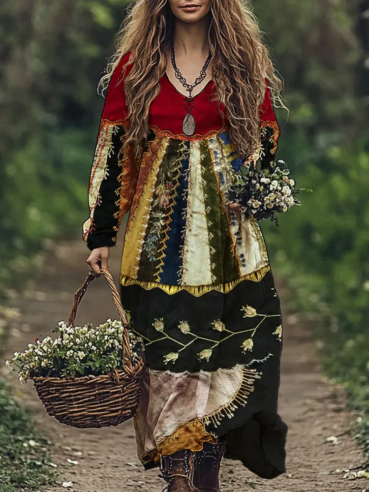 Vintage Floral Embroidery Women's Linen Maxi Dress