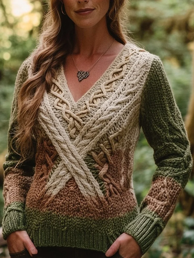 Vintage Gradient Celtic Knot Chunky V-neck Irish Aran Sweater