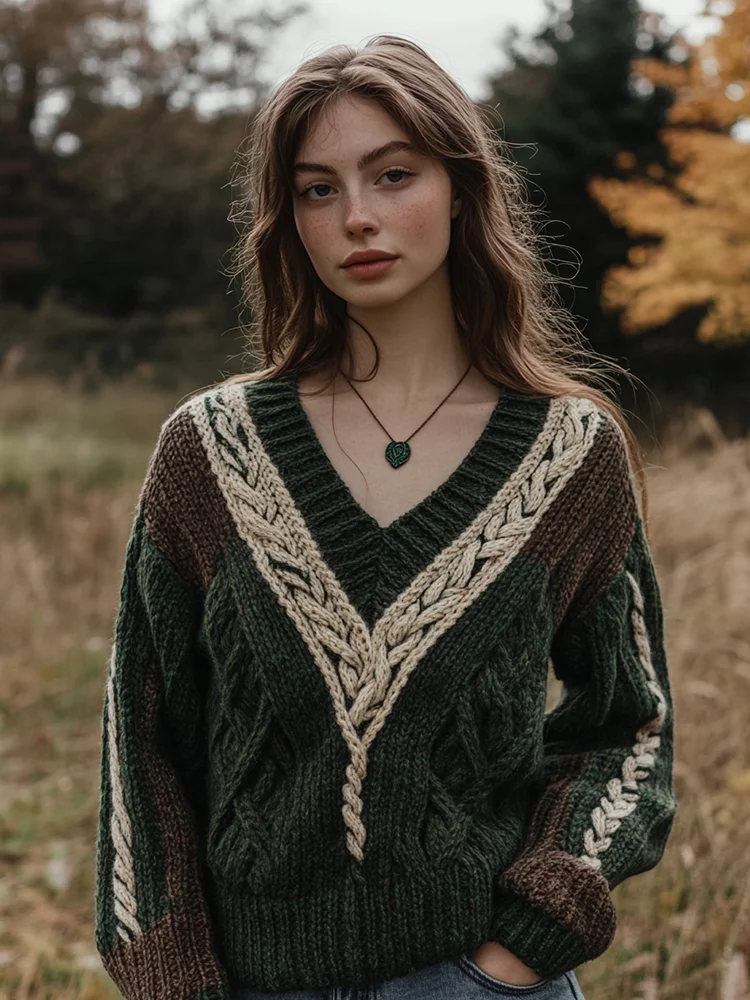 Vintage Irish Celtic Chunky Knit Cozy Warm V Neck Sweater