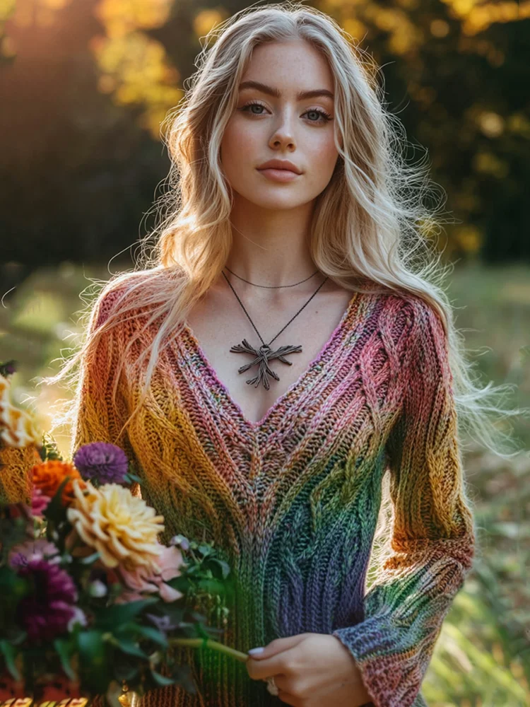 Vintage Irish Rainbow V-neck Knitted Jacquard Aran Sweater