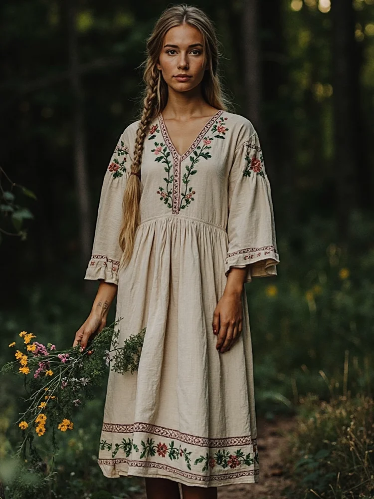 Vintage Plant Floral Embroidered V-neck Cotton Linen Dress