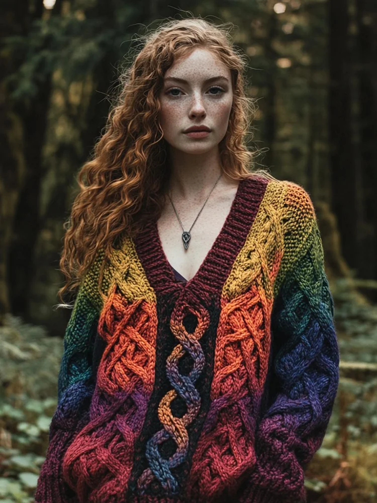 Vintage Rainbow Gradient Celtic Jacquard Chunky V-neck Aran Sweater