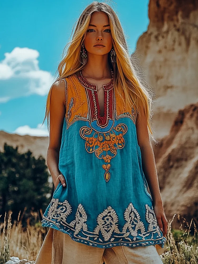 Vintage Tribal Ethnic Floral Embroidery Art V-neck Linen T-shirt