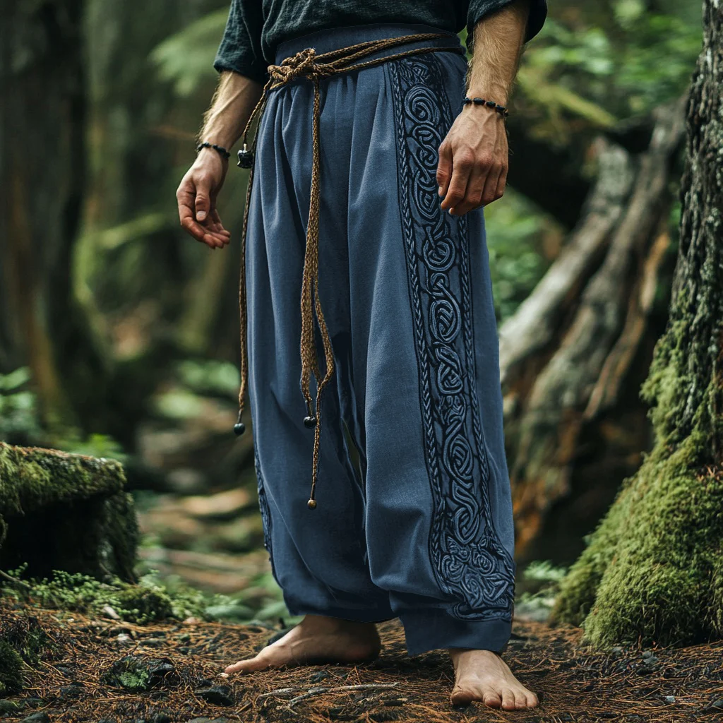 Vintage Tribal Viking Celtic Embroidery Art Linen Long Loose Wide-leg Pants