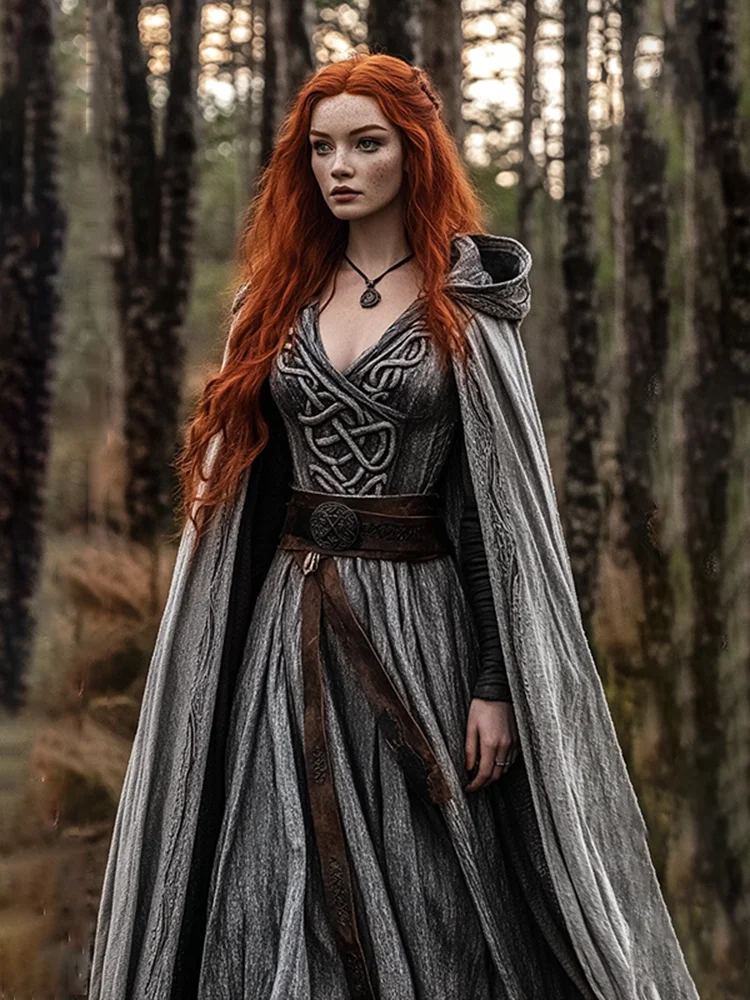 Vintage Viking Celtic Knot Cotton Linen V Neck Mixi Dress