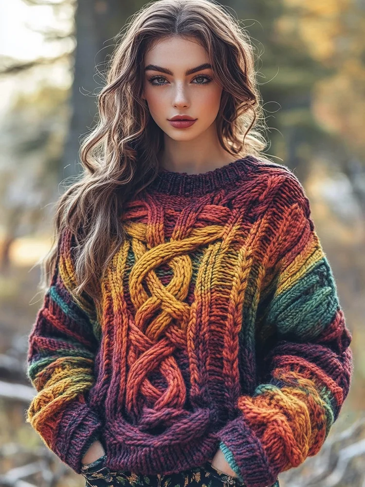 Women's Celtic Knot Art Knit Jacquard Crew Neck Sweater