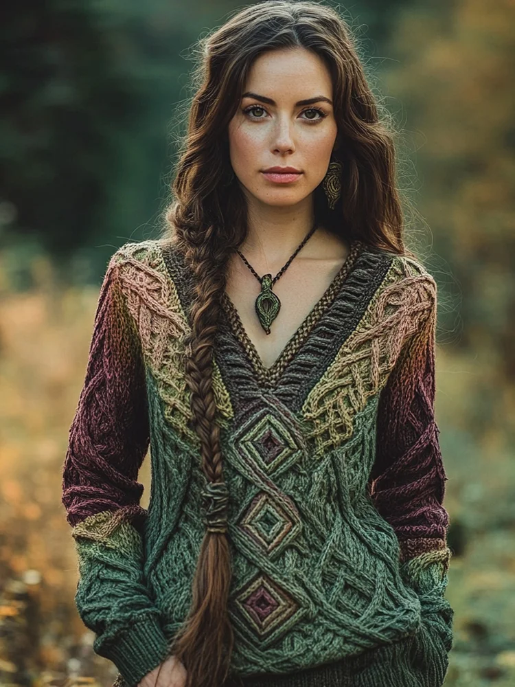 Women's Celtic Knot Design V-neck Forest Gradient Sweater