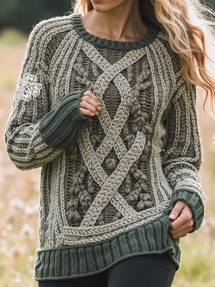 Women's Celtic Knot Jacquard Contrast Crew Neck Sweater