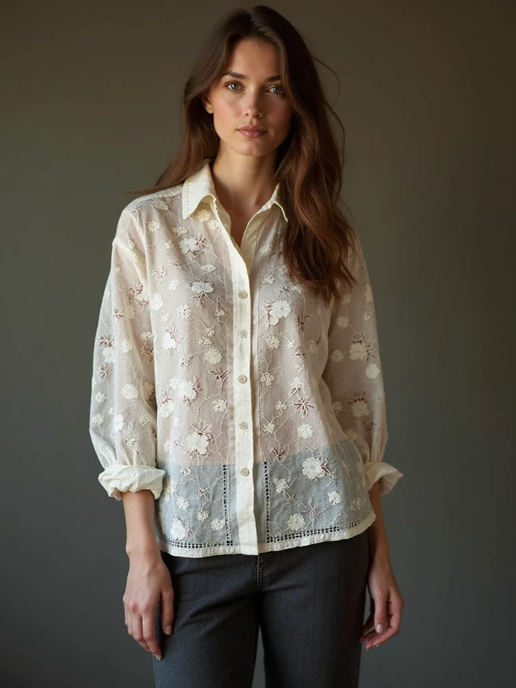Women's Floral Lace Embroidery Art Long Sleeve Shirt