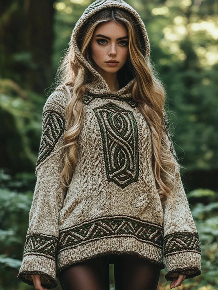 Women's Irish Celtic Knot Jacquard Contrast Hooded Sweater