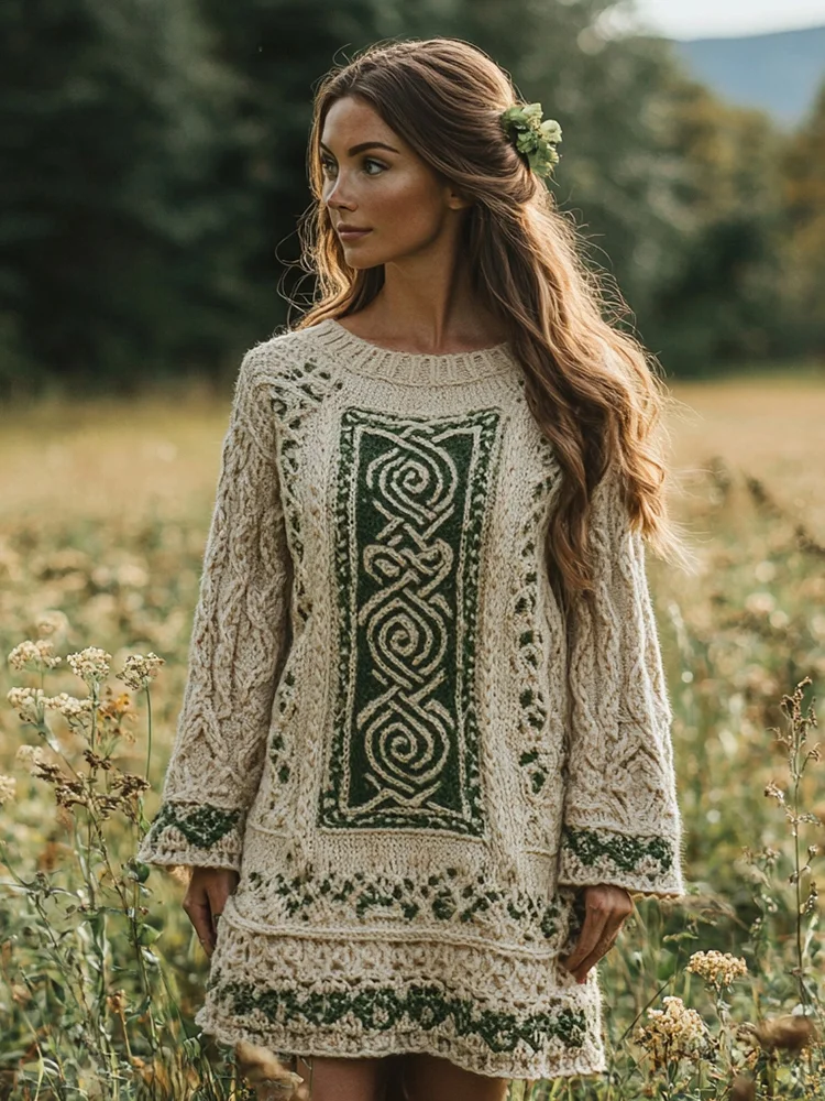 Women's Irish Celtic Knot Jacquard Crew Neck Contrast Color Sweater Dress