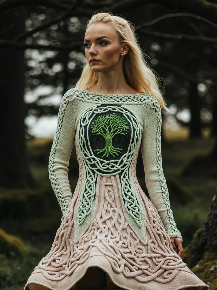 Women's Irish Celtic Tree Of Life Jacquard Retro Sweater Dress