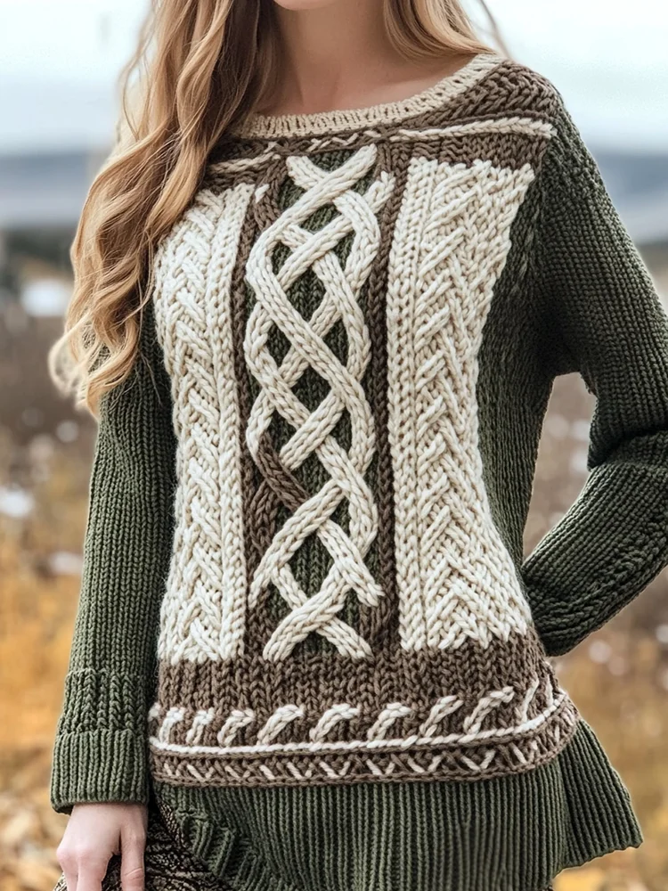 Women's Irish Pattern Jacquard Cozy Crew Neck Sweater