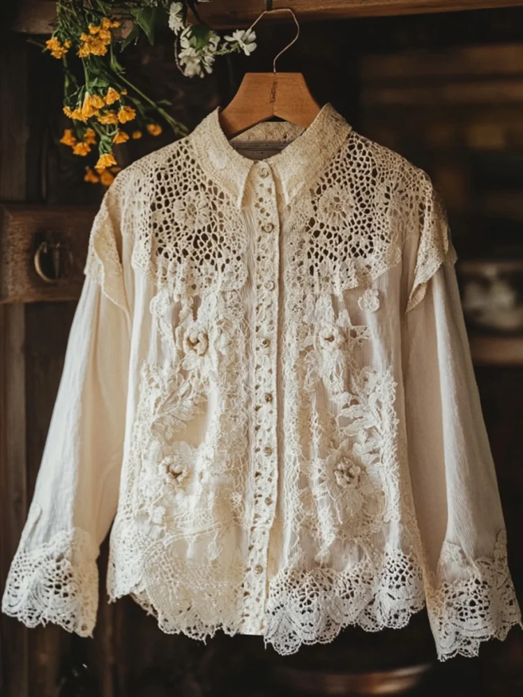 Women's Retro Floral Lace Embroidery Art Lapel Shirt