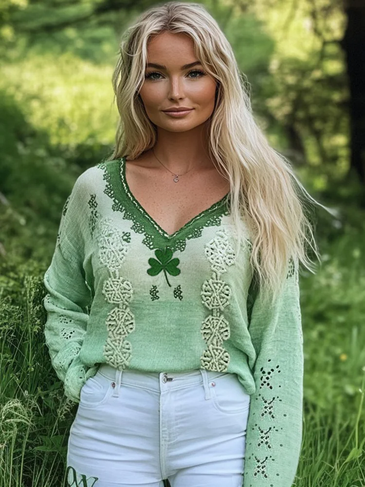Women's St. Patrick's Shamrock Celtic Knot Blend Linen V-neck Shirt