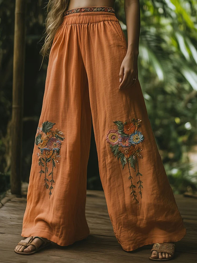 Women's Tribal Floral Embroidered Linen Lounge Pants