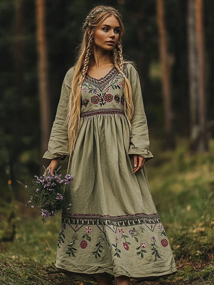 Women's Vintage Cotton Linen V-neck Embroidered Floral Dress
