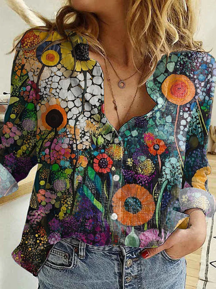 Women's Vintage Floral Art Painting Linen Button-down Shirt